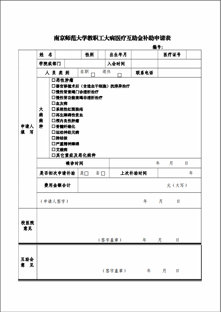 第十一条 医保二次报销后,上一个自然年度个人账户自付和个人自费累计超过1万元(不包含1万元)的患重大疾病会员可申请补助。申请补助须填写《南京师范大学教职工大病医疗互助金补助申请表》,提交校医院审核。